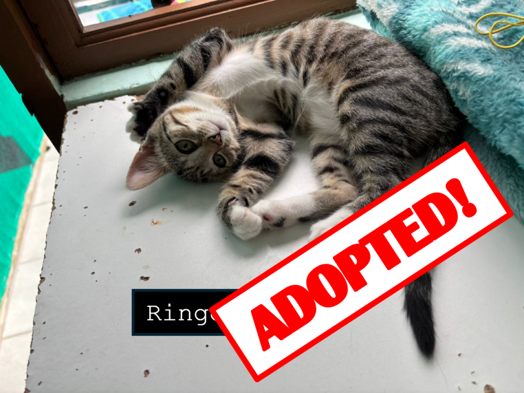 Playful and sweet. Came in with three siblings and mom Riley. Gorgeous tabby and white, tabby markings on tummy. Twin of his sibling Romi.